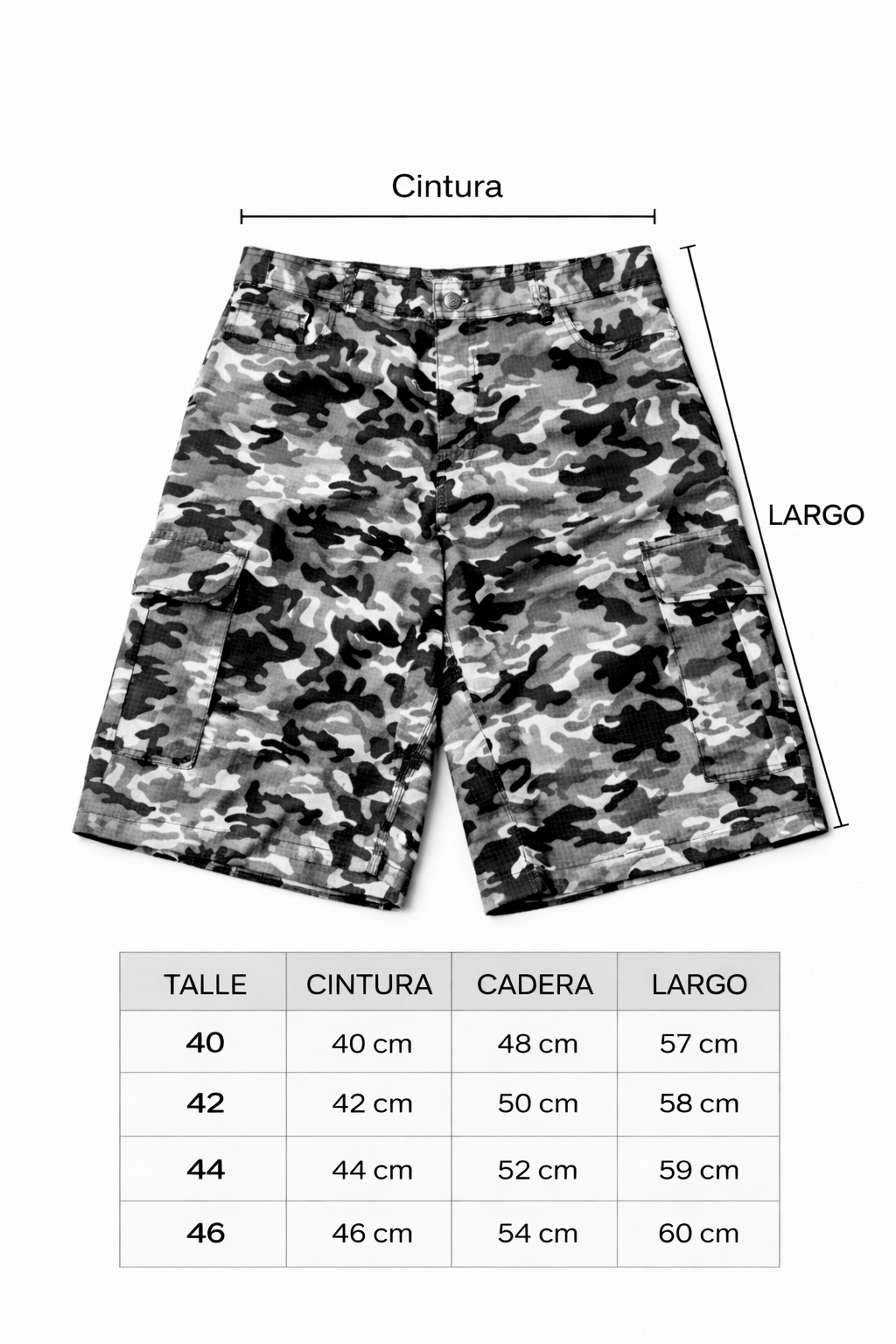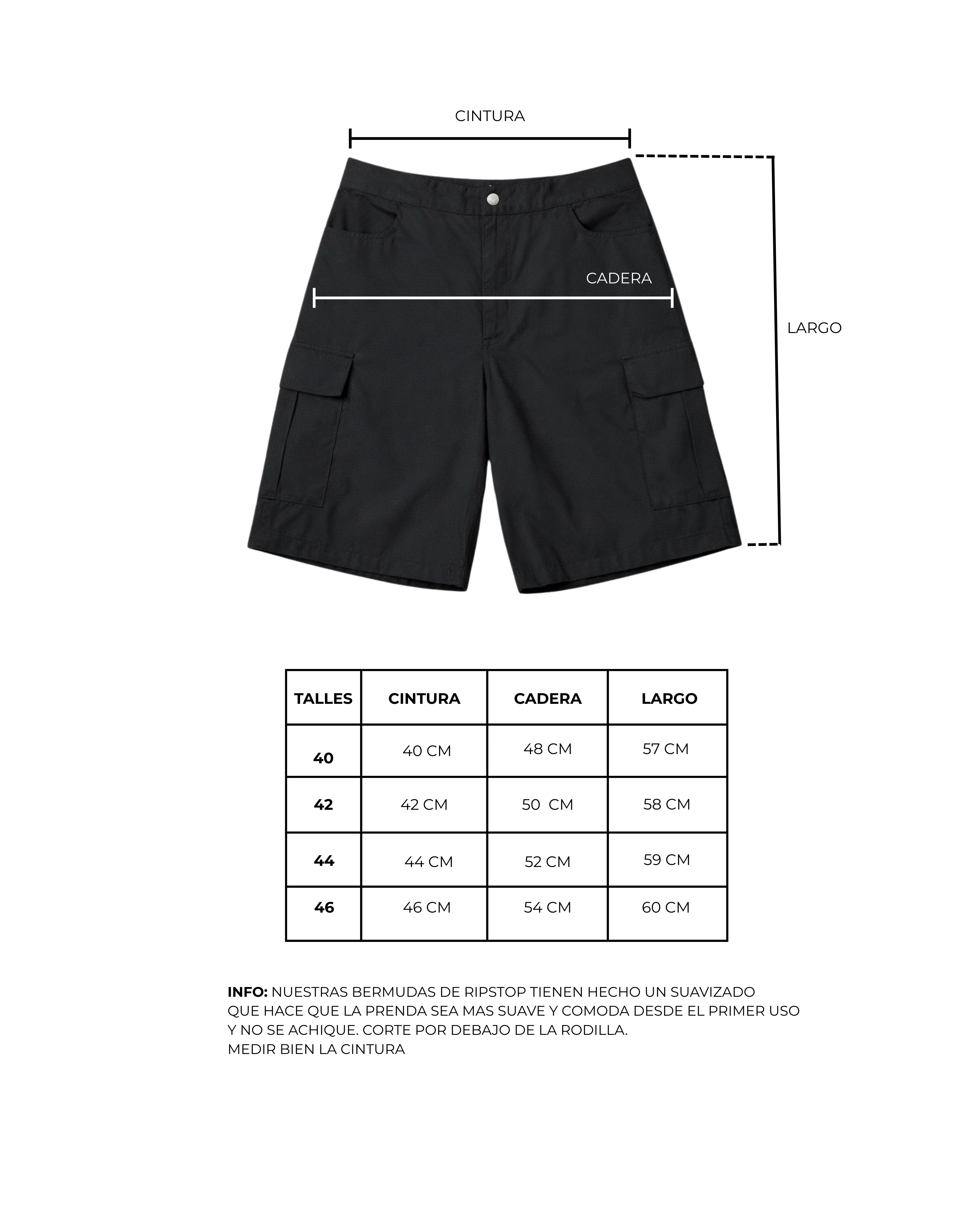 Presenta un corte preciso por debajo de las rodillas, logrando un equilibrio entre estructura y comodidad. El diseño se completa con bolsillos cargo laterales, que refuerzan su carácter utilitario, y botón personalizado, aportando un detalle distintivo y de calidad.